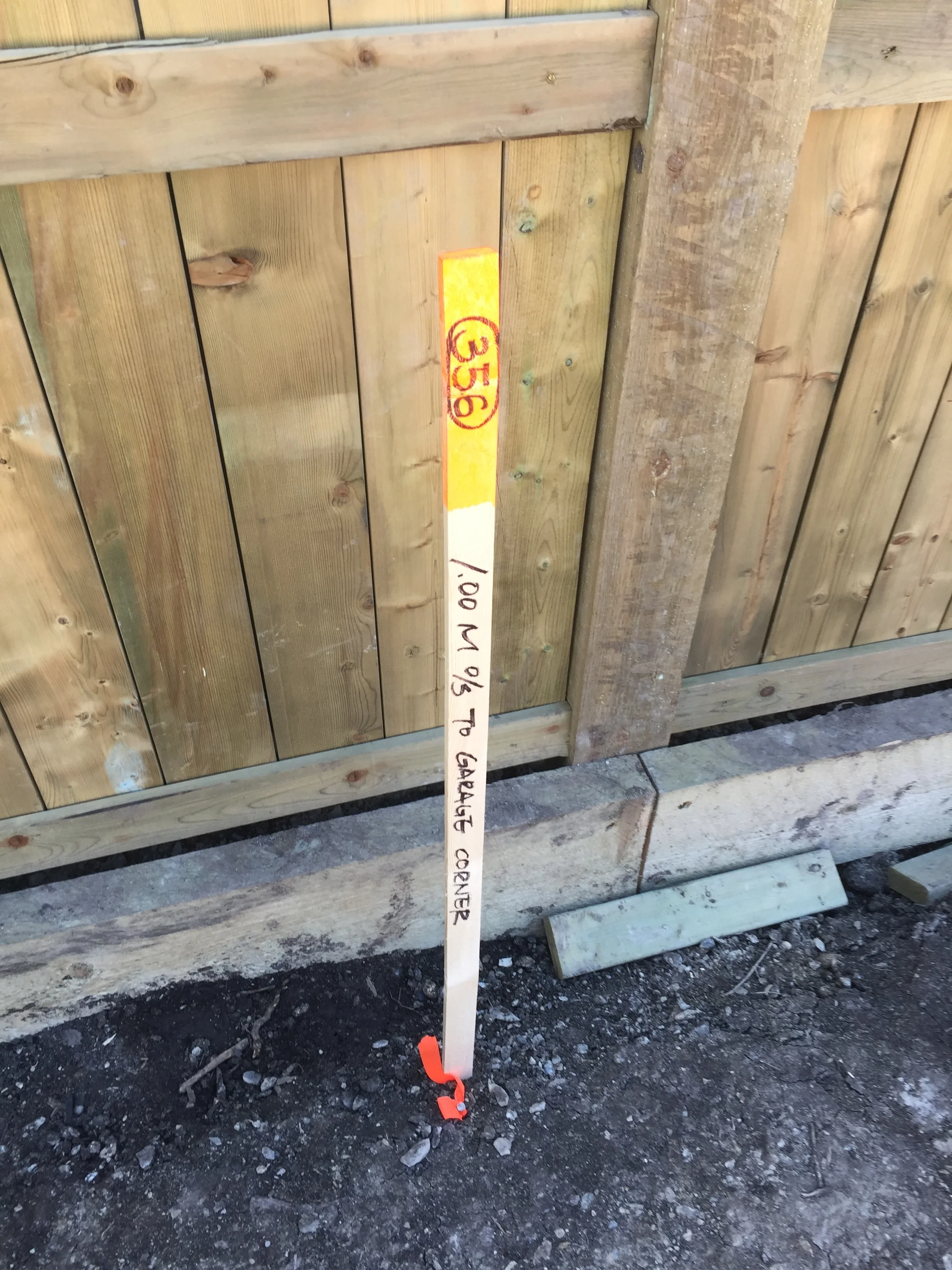 All of this work is contingent on getting the garage in the right spot. For this the surveyors we're back today. We have the four corners marked and the height of Slab identified. If the weather holds and the crew is available we will have the slab done in a week.