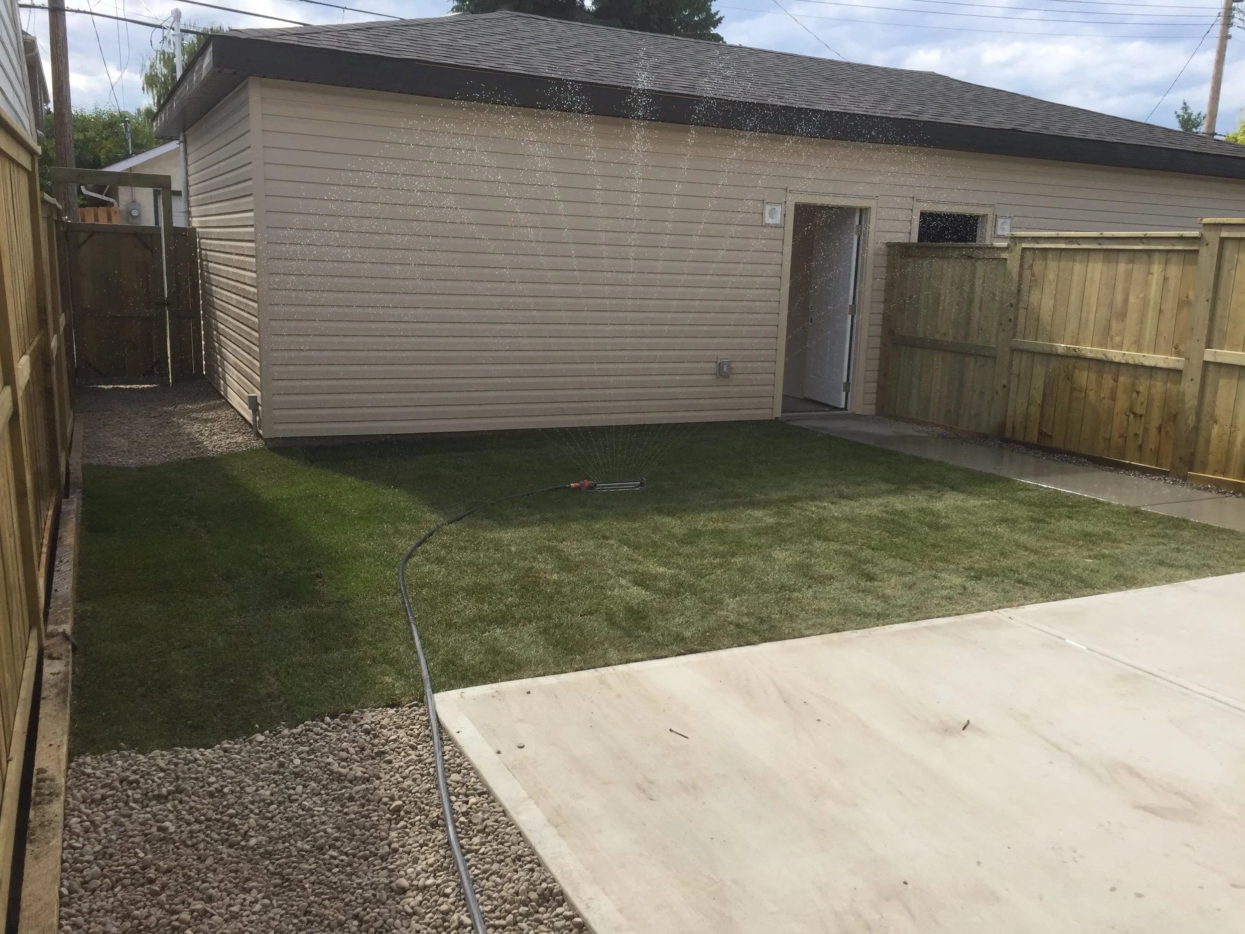 With the gate on, grass planted, and sprinkler running, we can call this back yard complete. We painted the garage man door and the trims today, so we are ready to clean out the garages of all the junk that has accumulated and finish these houses.